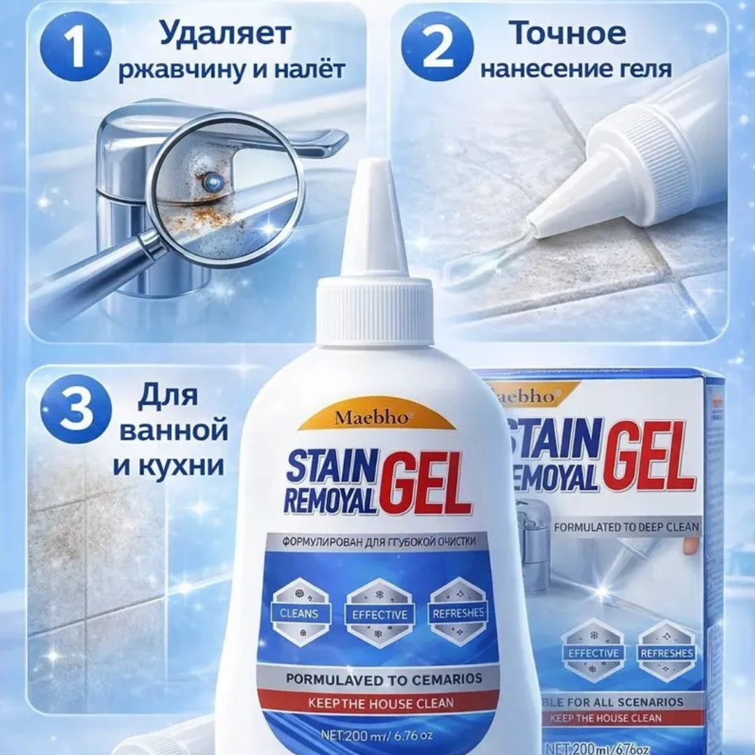 Stain Removal Gel можно использовать в квартире, доме, офисе, отеле или арендном жилье. Формула разработана для глубокой очистки без абразивов, что делает средство безопасным для большинства поверхностей при соблюдении инструкции.
