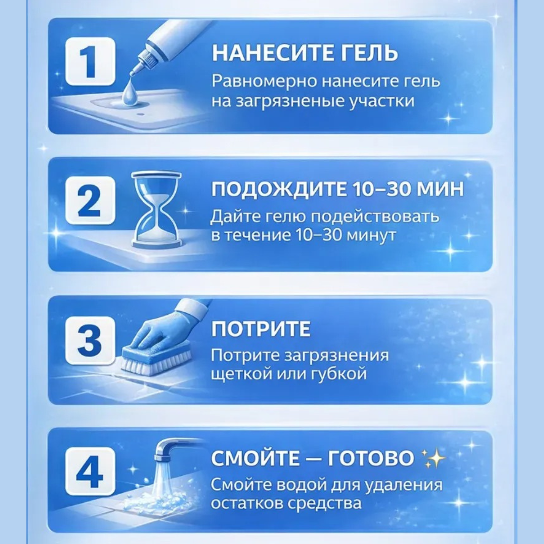 Густая гелевая консистенция не растекается и позволяет средству работать именно там, где это нужно. Благодаря удобному носику гель легко наносится на швы, стыки, изгибы смесителей и труднодоступные участки. Подходит для очистки раковин, кранов, душевых кабин, плитки, кафеля, ванн, кухонных моек и других влагостойких поверхностей.