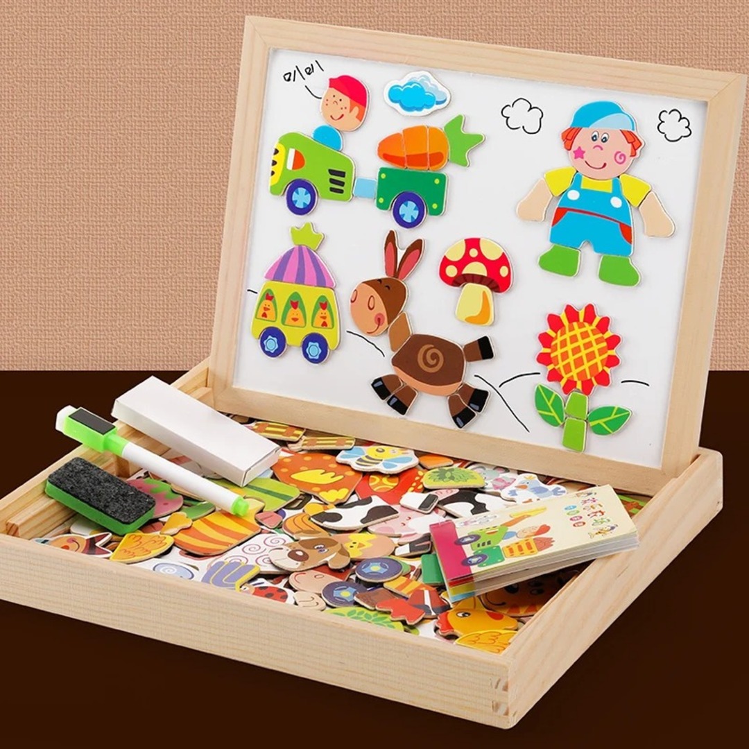 ЛЮБОЙ ребенок от 2 до 5 лет будет СЧАСТЛИВ получить в подарок такую развивающую игрушку для малышей! Она увлекает надолго - ведь в ней есть разные животные, насекомые, деревья, цветы и настоящий Фермер - мальчик на тракторе! Настоящий чудо-чемоданчик! Разный размер магнитиков просто отлично развивает мелкую моторику пальчиков. Также игра развивает логику и усидчивость, ведь представляет собой магнитный пазл. Развиваем творческие способности - подходит для рисования маркером или мелками, дорисовываем элементы, придумываем истории, создаем своих животных и персонажей. Доска двусторонняя, на одной можно рисовать маркером из комплекта, вторая - грифельная. Увлечет всю семью! Дети будут в восторге!!! Отличный подарок для ребёнка , для девочек или мальчиков на день рождения. Подходит для детского сада и раннего развития ребенка по системе Монтессори.