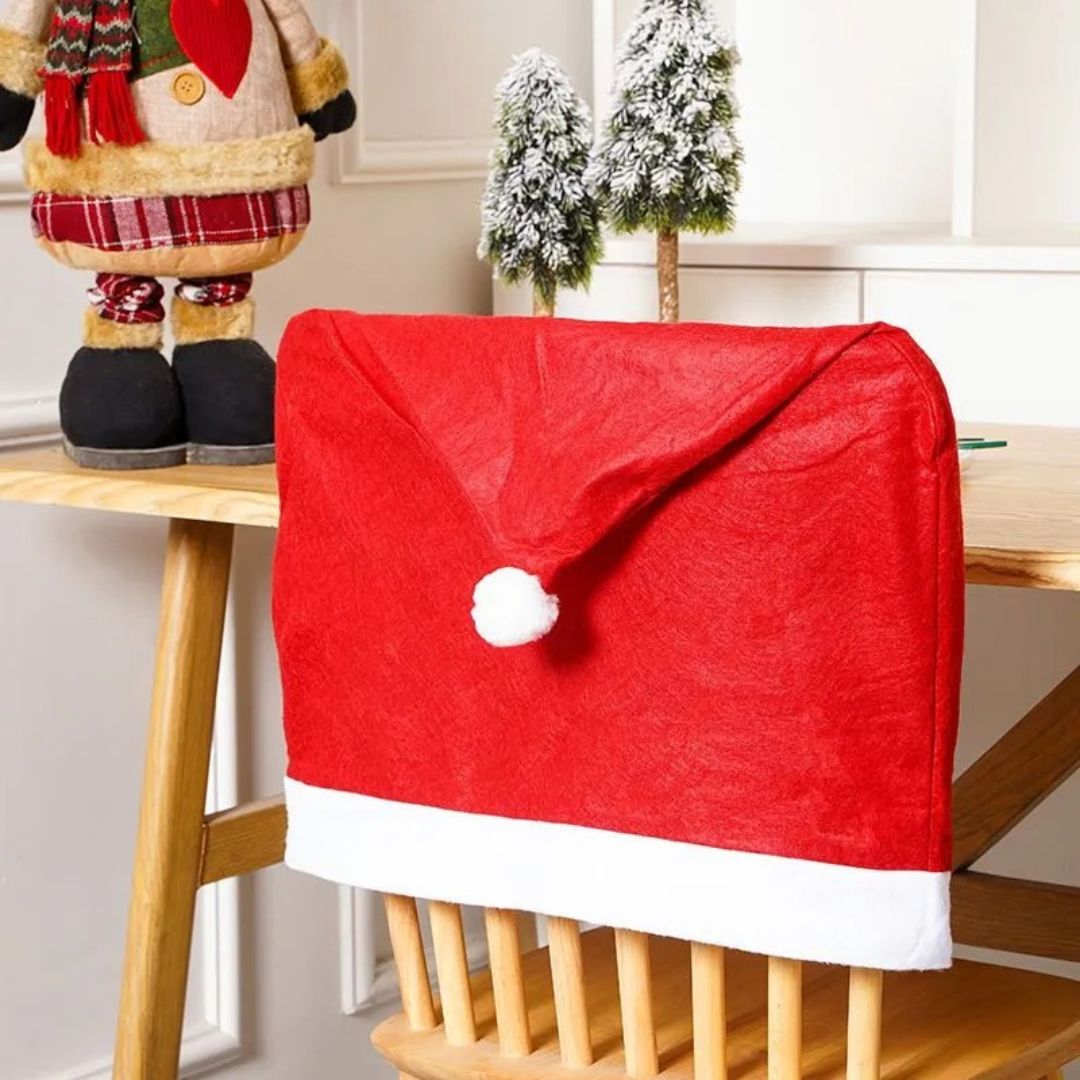 Новогодний чехол-накидка на стул в форме колпака Санта Клауса с белым пушистым бубончиком — стильный и практичный декор для праздничного интерьера. Легко надевается на спинку стула, создавая атмосферу уюта и праздника всего за пару секунд.