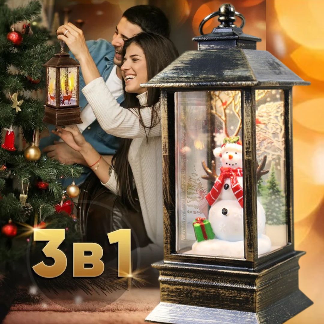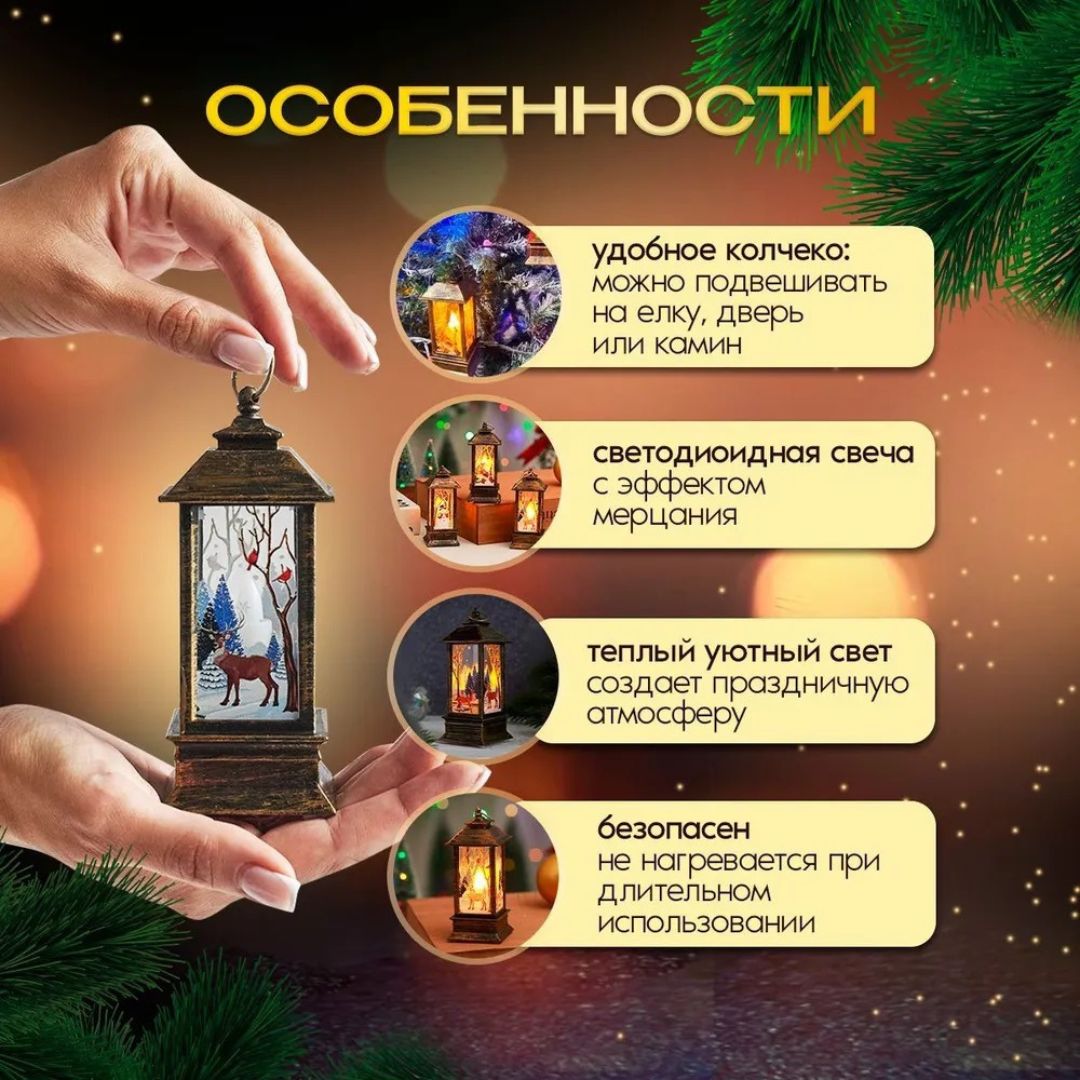 Новогодний фонарь светильник с подсветкой декоративный напоминает волшебную беседку, на стенках которой разыгрался целый зимний сюжет. Обитатели сказочного леса в новогоднем фонарике готовятся к встрече Нового Года. Милая и умиротворяющая иллюстрация новогодней игрушки! Светильник фонарь, это новогодний аксессуар, который будет превосходно смотреться в праздничном интерьере. Новогодний светильник - оригинальный и стильный элемент праздничного оформления. Станет отличным дополнением если у вас в доме есть свечи и гирлянда, бусины и шарики. Фонарик в котором фигурки, отлично впишется как статуэтка на камин. Декоративный светильник прекрасно впишется в любой интерьер и добавит в него тепла и уюта. Это не просто декоративное украшение на котором изображен олень - это, в первую очередь, функциональный предмет, способный создать уют и погрузить в настоящую атмосферу праздника в домик. Детский сувенир, как будто из сказки! Светильник фонарь имеет симпатичные рисунки в зимнем заснеженном лесу на стеклах, а внутри находится светодиодная лампочка с теплым светом, имитирующая свечу. Фонарик работает от батареек типа 3AАА(не входят комплект). Данный настольный светильник станет украшением кухни или гостиной, квартиры, а также его можно использовать как декорации в спальне в качестве ночника. Он также может быть использован в качестве фигуры под елку. Светильник светящийся станет прекрасным подарком на Новый год или Рождество, который оценят и взрослые, и дети. Новогодний декор для дома помогает создать праздничное настроение! Создайте рождественский уют. И пусть созданная нарядная композиция радует вас и ваших близких. Игрушечный дед Мороз или Санта Клаус, снеговик, станут отличным дополнением к нашему новогоднему фонарику.