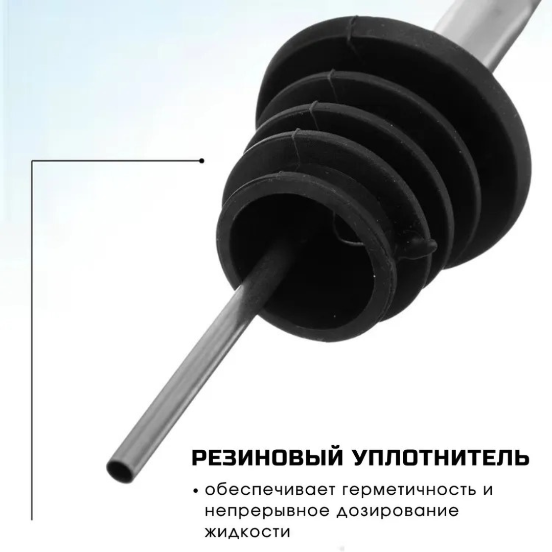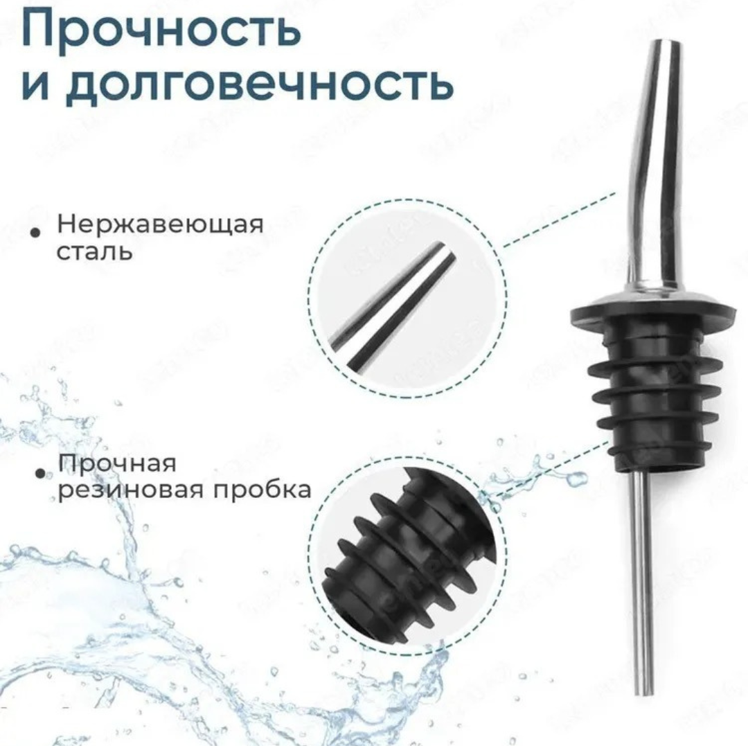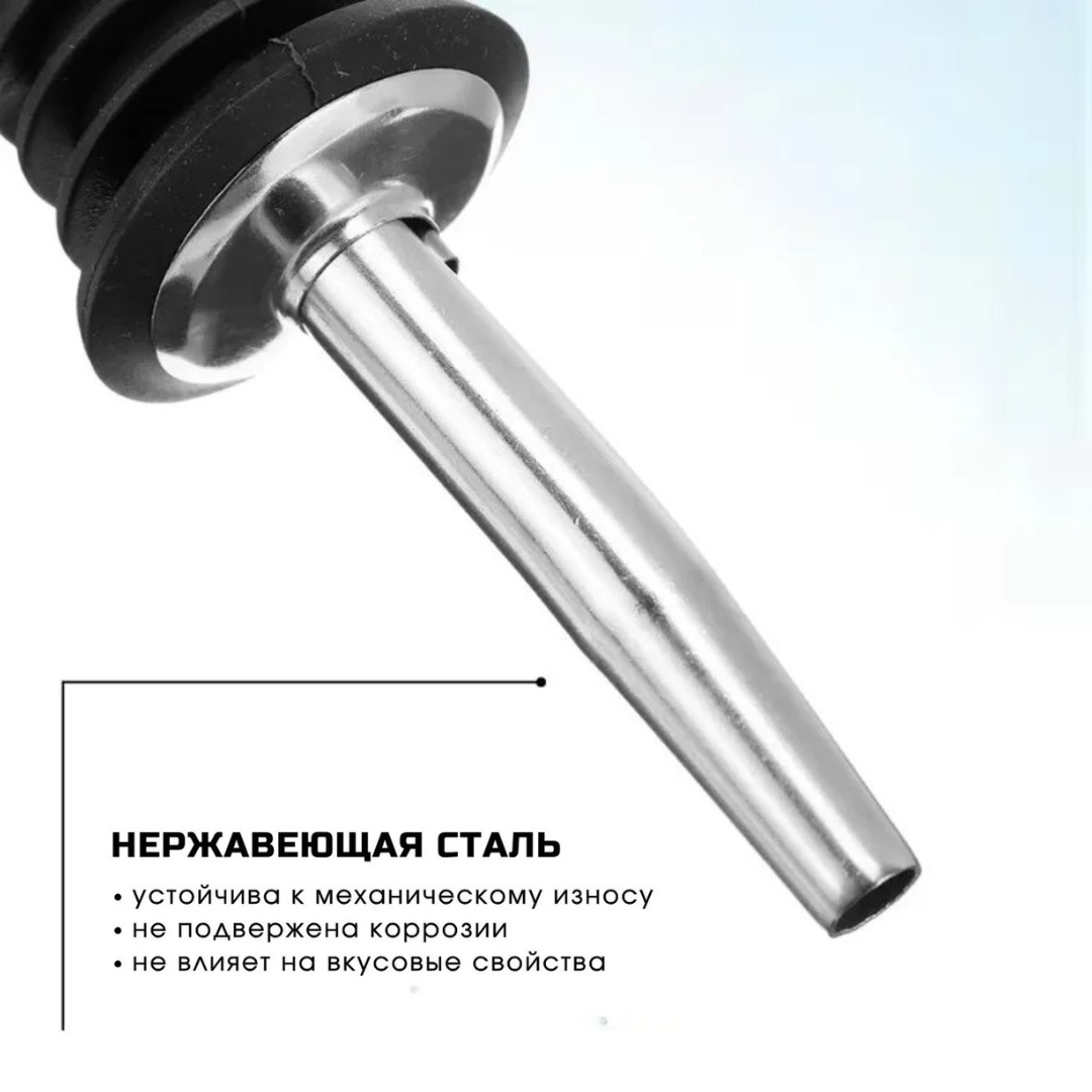 Пробка для бутылки изготовлена из прочной нержавеющей стали, которая обеспечивает высокую стойкость к механическому износу, не подвержена коррозии, а также не влияет на вкусовые свойства. Дозатор для сиропа имеет специальный резиновый уплотнитель, который обеспечивает герметичность. Также пробка для вина имеет специальное отверстие-воздухоотвод для непрерывной струи. Насадка дозатор для бутылки алкоголя имеет ширину основания, подходящую для всех стандартных стеклянных бутылок. Дозатор для напитков подходит для многих производителей вина, рома и виски.