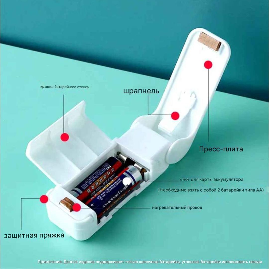 Принцип работы: Использует термический метод запайки. Нагревательный элемент (обычно нихромовая нить) быстро нагревается при сжатии устройства, плавит края пакета и создает прочный шов, который не расходится.