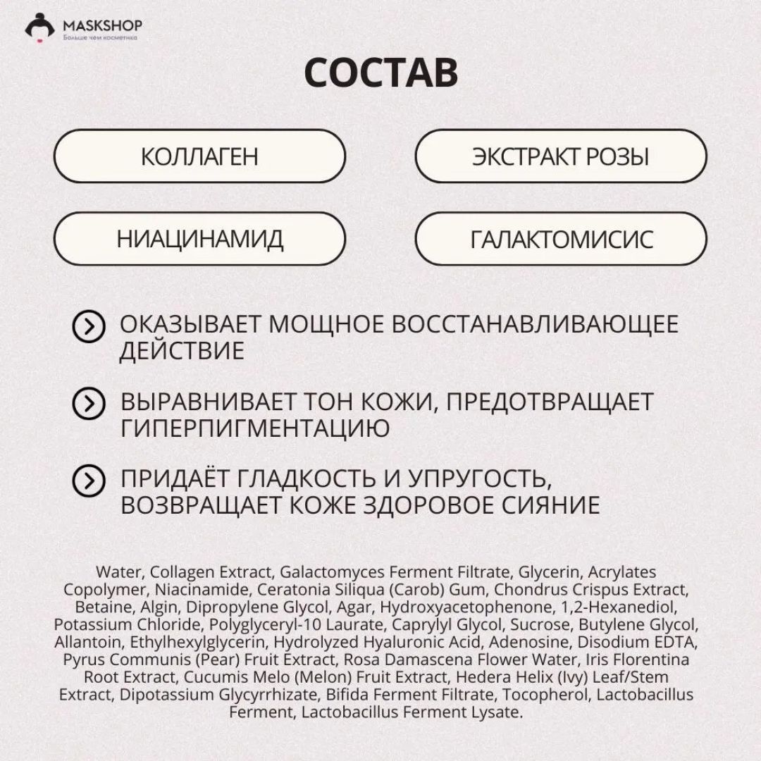 Purified Water, Galactomyces Fermentation Filtrate,Glycerin,Acrylate Copolymer,Niacinamide,Carob Gum,Irish Moss Extract, Betaine, Algin,Dipropylene Glycol, Agar, Hydroxyacetophenone, 1,2-hexane dihydrogenAll, Potassium Chloride, Polyglyceryl-10 Laurate, Caprylyl Glycol,Sucrose, Butylene Glycol,Allantoin, Ethylhexylglycerin,Hydrolyzed Hyaluronic Acid, Adenosine, Disodium Edta, Pear Extract,Collagen Extract ( 55,000 ppb), Dippotassium Glycyrrhizate, Bifida Fermentation Filtrate, Tocopherol, Lactobacillus Fermentation,Lactobacillus Fermentation Lysate.
