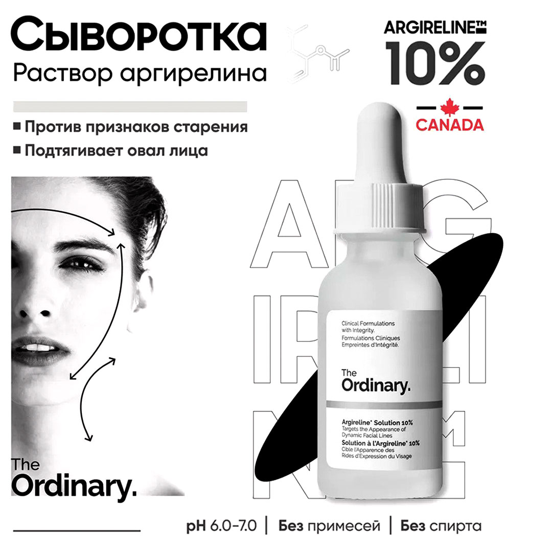 Сыворотка 10% Agireline Solution от популярного бренда бьюти-средств The Ordinary представляет собой невесомое средство, содержащее концентрацию компонента аригелин с запатентованной формой молекулы Acetyl Hexapeptide-3, которая эффективно предотвращает сокращения мышц, тем самым уменьшая проявление мимических морщин и дряблости кожи.Сыворотка создана на водной основе, что обеспечивает ее оптимальное хранение и эффективность. Это передовое средство действует как "ботокс в баночке" — ее продолжительное использование позволяет добиться мощных омолаживающих результатов. Кожа становится более упругой и ухоженной, улучшаются структурные контуры лица.Сыворотка ординари от морщин. Не содержит масла, спирта и орехов. Подходит для веганов. Не тестировалось на животных.