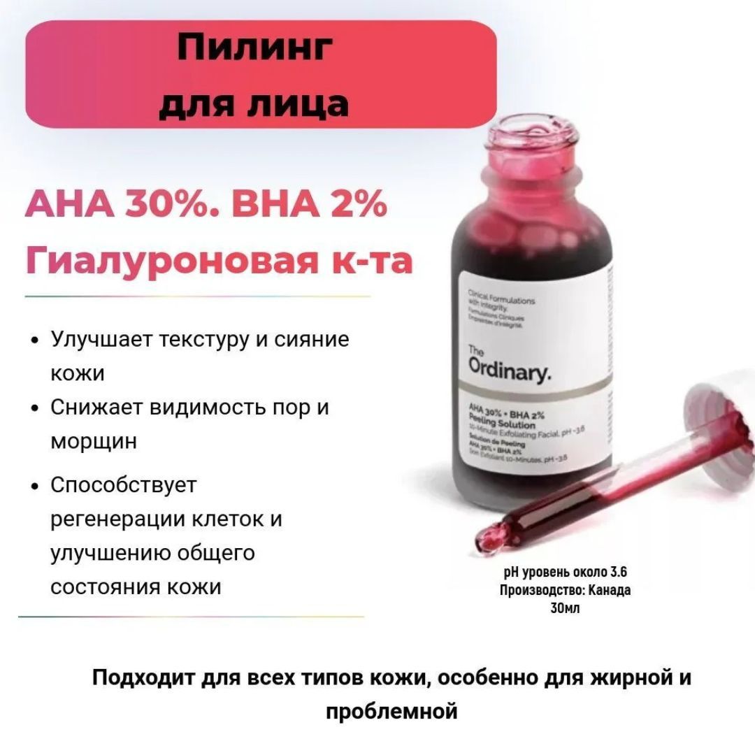 Преобразите кожу при помощи эффективного пилинга The Ordinary AHA 30% + BHA 2% Peeling Solution, который стимулирует обновление клеток и всего за десять минут заметно освежает кожу.