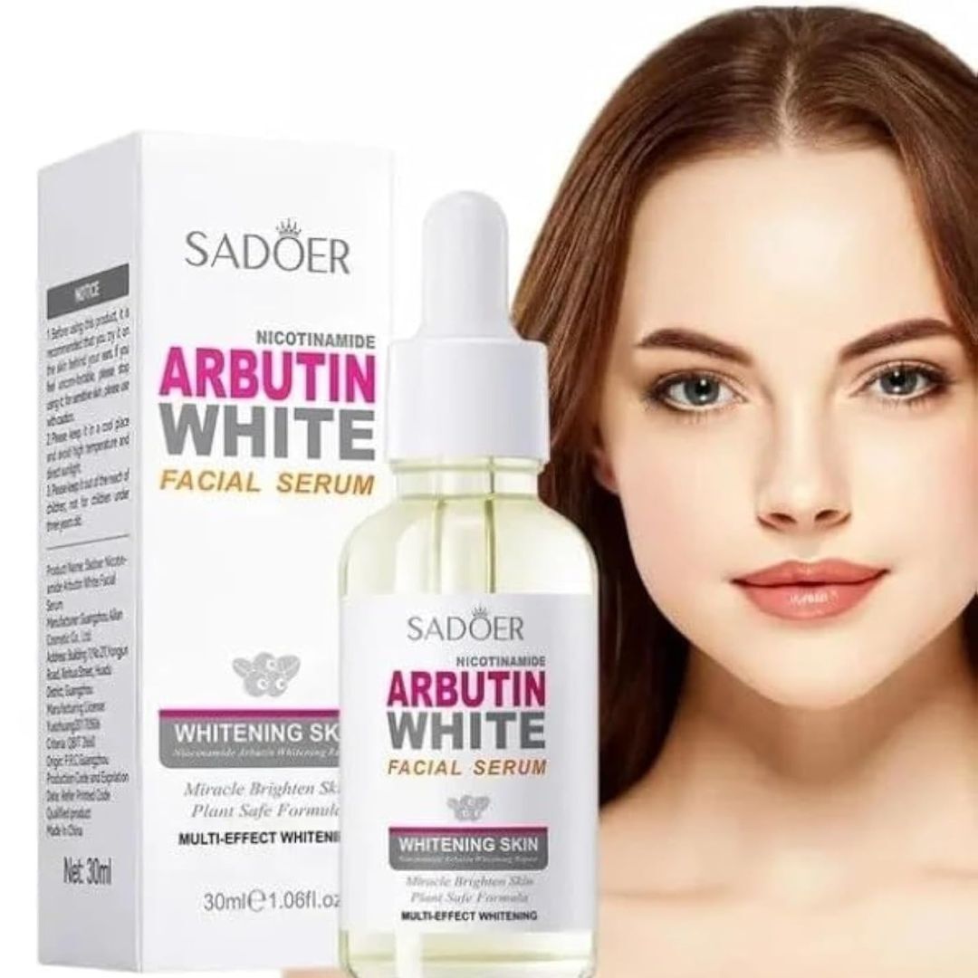 Осветляющая сыворотка для лица Sadoer с арбутином 30 мл. Сыворотка - высококонцентрированный продукт, который применяется вместе с другими ухаживающими средствами, следуя правильной очередности применяемых продуктов. Сыворотка наносится перед использованием крема или геля для лица. Имеет плотную концентрацию полезных веществ, поэтому действует гораздо эффективнее крема. Сыворотка весьма экономична в использовании, так как достаточно всего 3-4 капли средства для питания кожи. Область применения: лицо, шея и зона декольте. Арбутин в составе сыворотки добывается из листьев бузины, брусники и других растений и имеет отбеливающее действие. Арбутин бережно осветляет кожу, устраняя пигментные пятна, веснушки, темные круги под глазами. Также борется с отечностями. После применения сыворотки с арбутином выровняется тон кожи и микрорельеф, улучшится цвет лица. Кожа станет здоровой и ухоженной, исчезнут следы пигментации и отеки/