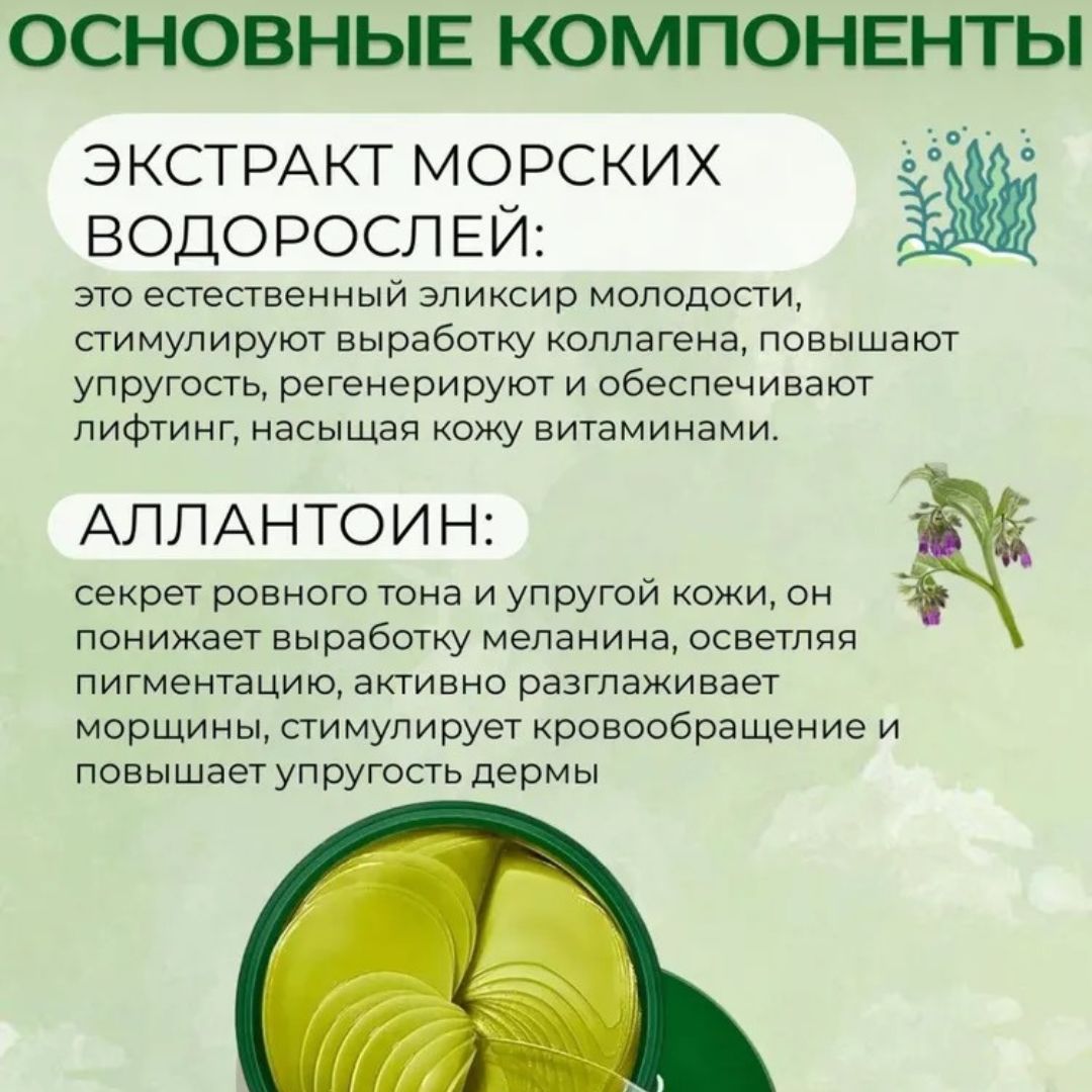 Эти патчи активно увлажняют кожу, способствуя её регенерации и улучшению внешнего вида. Экстракт морских водорослей известен своими антивозрастными свойствами, что делает этот продукт идеальным для людей, стремящихся замедлить процессы старения и вернуть своей коже упругость.