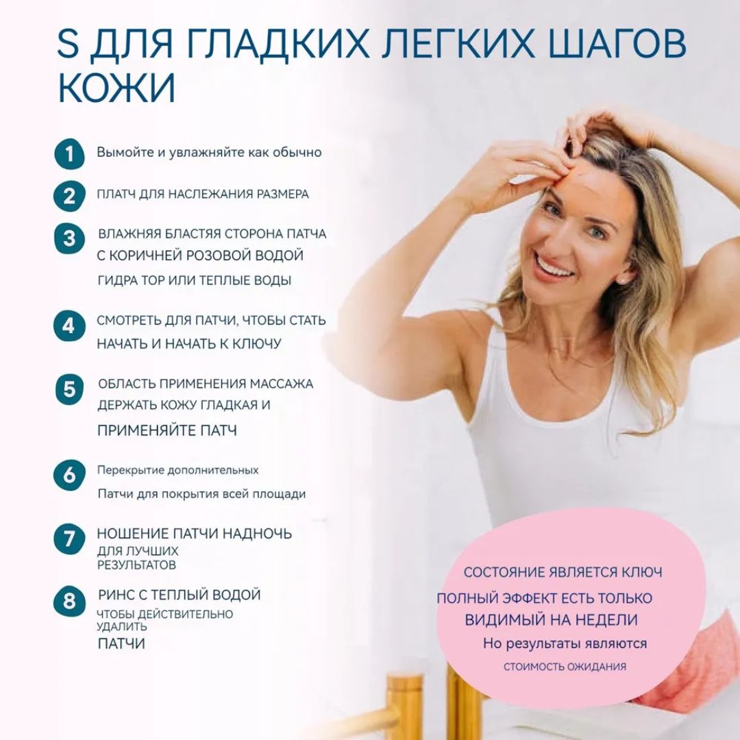 Нанесение: Одной рукой аккуратно разгладьте морщину, а другой плотно прижмите патч. Удерживайте его несколько секунд до фиксации. Для зоны лба рекомендуется наклеивать несколько патчей внахлест, создавая единую жесткую конструкцию.
