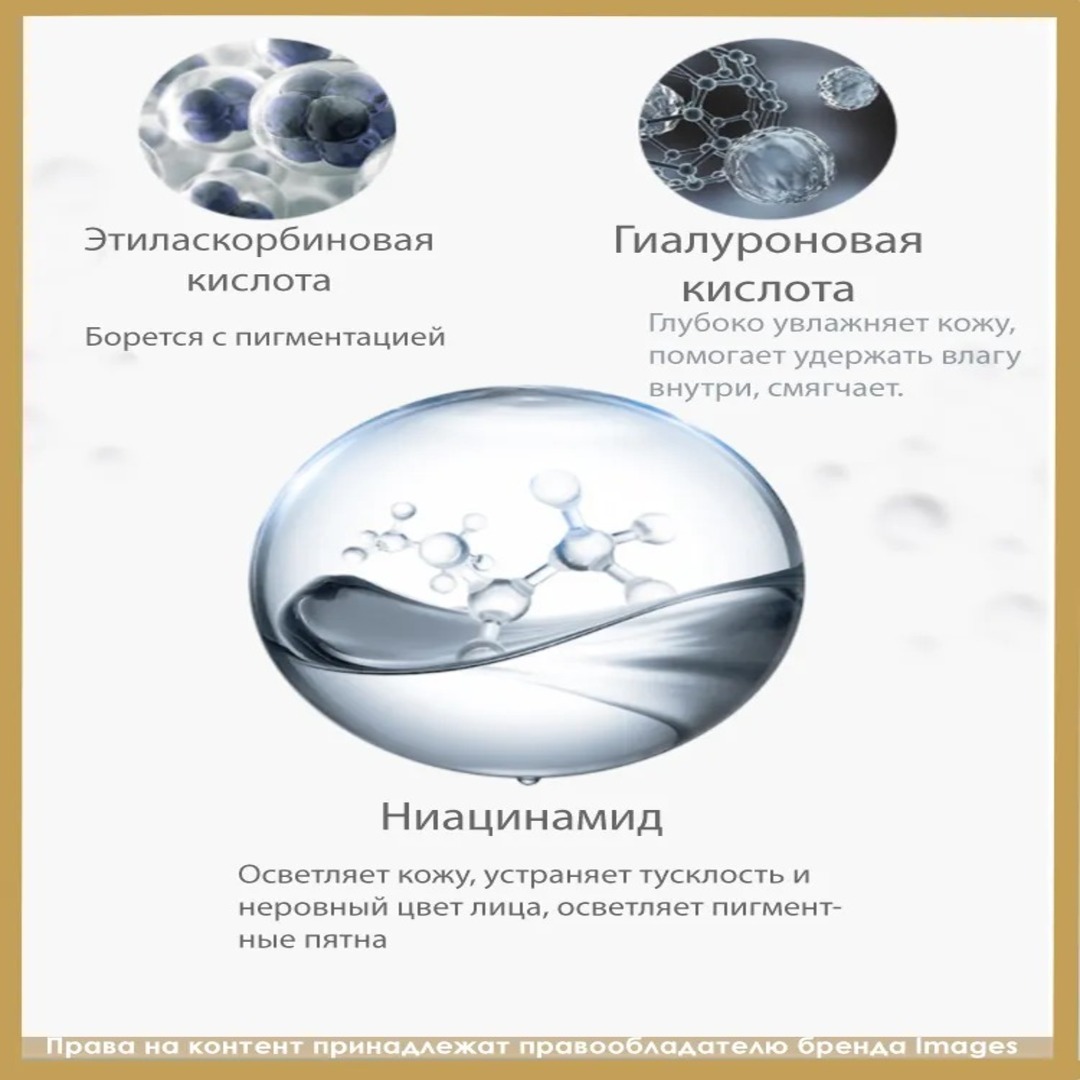 Вода, глицерин, пропиленгликоль, изопропилмиристат, этилгексилпальмитат, акрилат натрия/акрилоилдиметилтаурин, сополимер натрия, изогексадекан, полисорбат-80, сорбитан олеат, диметикон, ПЭГ-100 стеарат, глицерилстеарат, бетаин, цетеариловый жирный спирт, ниацинамид, аллантоин, фенилэтанол, метилпарабен, токоферол (витамин Е), карбомер, парабен, отдушка, гиалуронат натрия, 3-0-Z-аскорбиновая кислота.